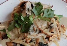Ржаные блины с жареными шампиньонами, луком и соусом из белых грибов