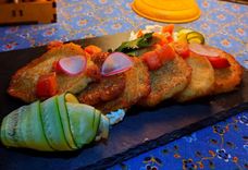 Ассорти из сала с маринованными овощами и чесночными гренками
